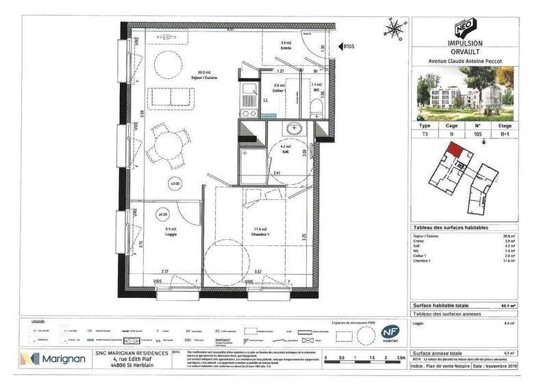 ORVAULT, dans une résidence neuve un appartement Type 2 de 43.10m² comprenant : Une entrée, un séjour donnant sur une loggia de 6.5m², une cuisine ouverte, un cellier, une chambre avec une salle d'eau attenante, wc séparés. Parking Couvert. Condition de ressources Loi Pinel