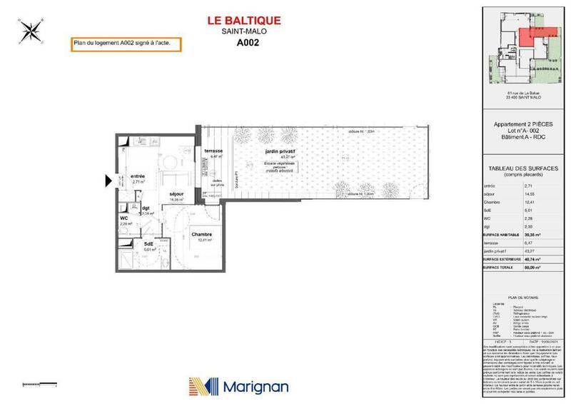 ST MALO- En rez-de-jardin d'une résidence neuve, un appartement 2 pièces MEUBLE de 39.35 m², comprenant une entrée avec un placard, une pièce de vie avec une cuisine aménagée et équipée (réfrigérateur, plaque de cuisson, hotte, four, micro-ondes), une chambre, une salle d'eau (équipée d'un lave-linge) et un wc indépendant. La terrasse de 6.47 m² ouvre sur un beau jardin privatif de 49.74 m².