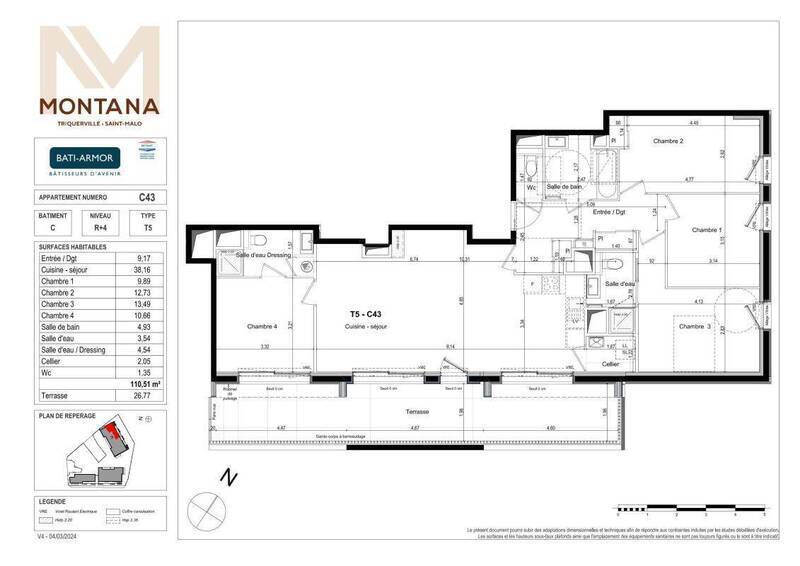 SAINT-MALO - quartier de l'hippodrome, COUP DE COEUR assuré pour ce grand appartement familial T5 d'environ 110 m² situé au 4ème et dernier étage d'une résidence neuve intitulée "Montana". Il comprend : Une entrée avec un placard, un séjour donnant sur une terrasse de 26.77m², une cuisine ouverte aménagée et équipée (plaque, hotte, four), une suite parentale avec salle d'eau privative et dressing, 2 chambres dont une avec un placard, 1 chambre avec sa salle d'eau privative, une salle de bains, wc séparés. 2 Garages. « Les informations sur les risques auxquels ce bien est exposé sont disponibles sur le site Géorisques : www.georisques.gouv.fr »