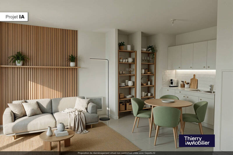 L'appartement comprend une pièce de vie ouverte sur cuisine, deux chambres confortables et une salle d'eau moderne.